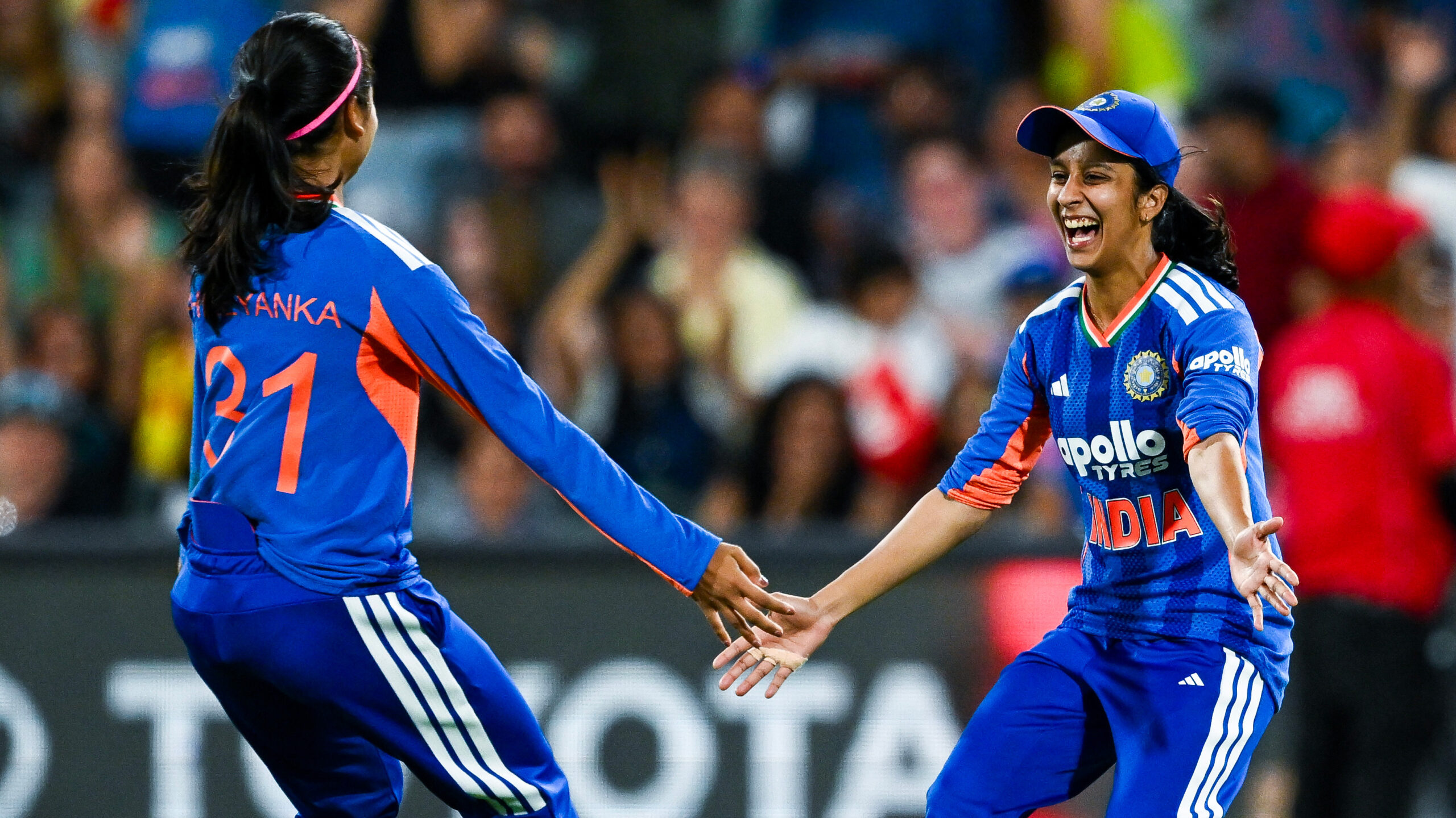 After Smriti Mandhana (82 from 55) and Jemimah Rodrigues (59 from 46) helped India post 6-176 – the highest total in women’s T20Is at Adelaide Oval – Shreyanka Patil (3-22) and Sree Charani (3-32) restricted to 9-159 despite a fighting 45-ball 57 from Ashleigh Gardner.
